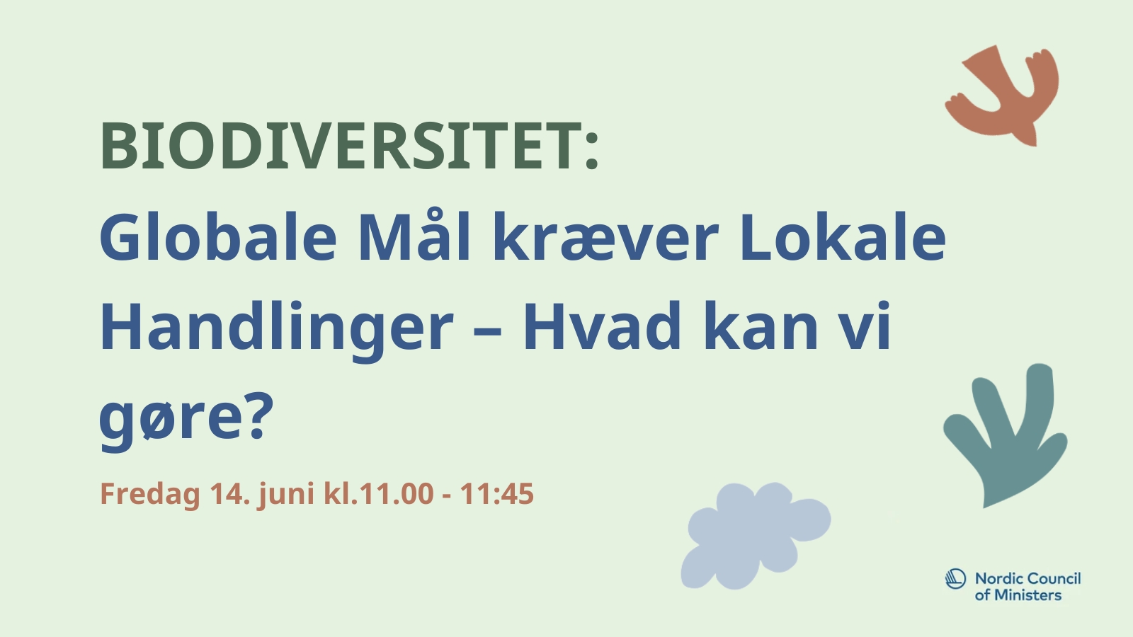 Hvilken rolle spiller lokalsamfund i Norden i forhold til FNs aftaler om klima, biodiversitet og Verdensmål? Hvad skal der til, for at aftalerne omsættes til rammer for lokale handlinger og løsninger i Norden ud fra de gamle ord: Tænk Globalt, Handl Lokalt? Lokale handlinger dækker over et bredt felt af aktiviteter, muligheder og perspektiver, og vi vil undervejs komme omkring det nordiske arbejde med biodiversitet, naturbaserede løsninger og UNESCOs biosfæreprogram. For at belyse spørgsmålene får vi indspil fra Nordhorland i Norge, Bornholms Regionskommune, GAIA med et ungdomsperspektiv og Københavns Universitet, som bringer et perspektiv in om arealanvendelse og den grønne trepart. Det hele koges sammen i en paneldiskussion, der i et nordisk perspektiv ser nærmere på og drøfter, hvad der skal til for at skabe et større og fælles ansvar mellem nationale og lokale myndigheder i Norden, virksomheder og civilsamfund for at udvikle lokale løsninger til de globale udfordringer.